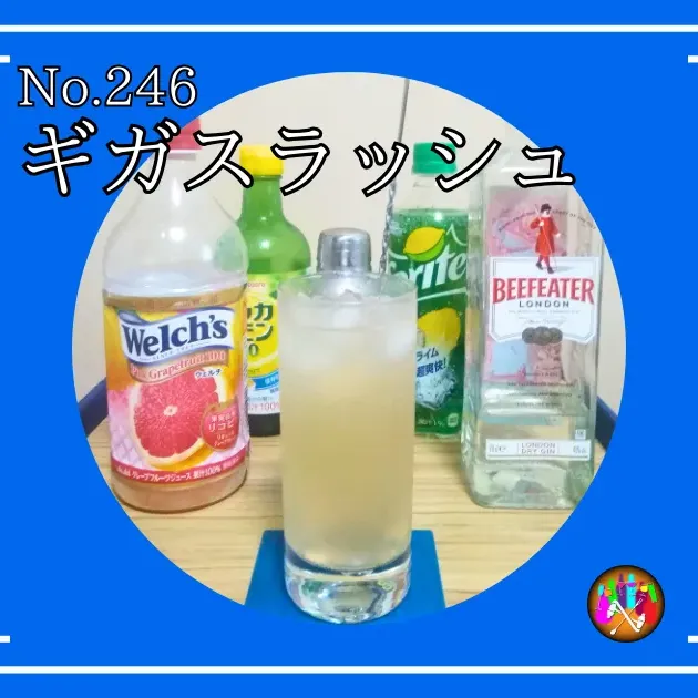 「ドラゴンクエスト」シリーズの必殺技「ギガスラッシュ」をイメージして作成したカクテルで、「ギガスラッシュ」らしく、色も薄い黄色で喉ごしにもスプライトの強い炭酸が効いていて表現できています。